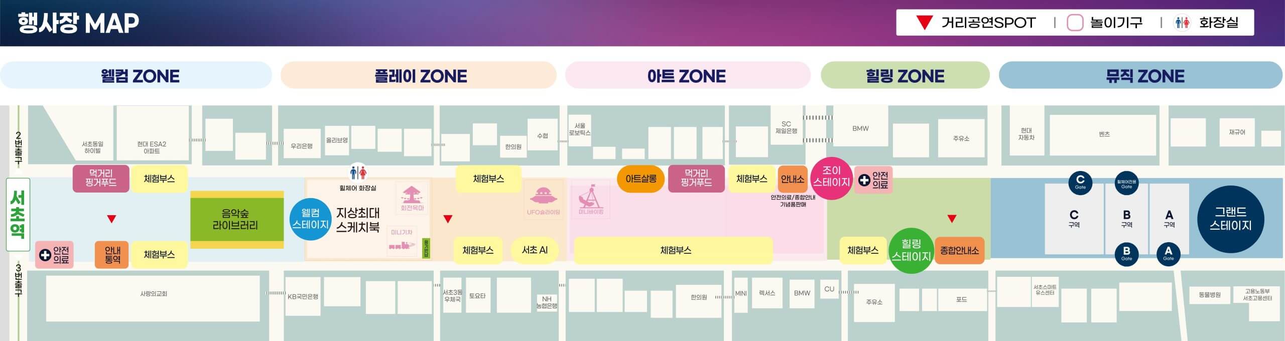 - 무대 위치 / 길 배치: 메인 무대 그랜드 스테이지는 반포대로 ~ 서초역~서초3동사거리 구간. 거리 전체가 보행자 자유 구역처럼 행사장으로 활용됨.