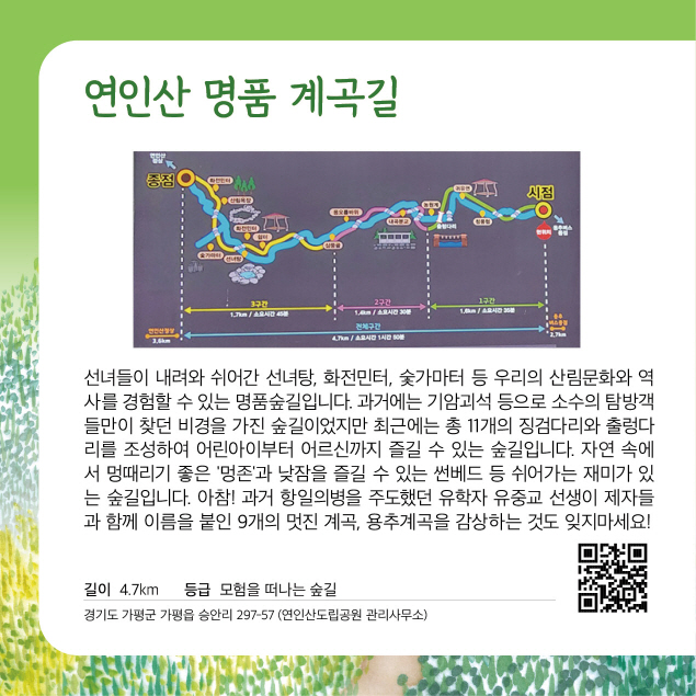 | 연인산 명품 계곡길 | 2.5~4h | 쉬움-보통 | 계곡 소리+단풍숲 | 시작~초중반(북부 산지) |