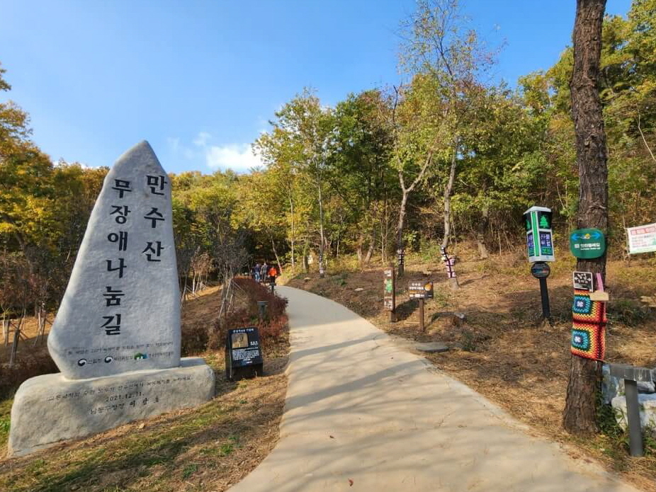 만수산 무장애숲길은 산림청이 지정한 ‘전국 100여 곳 무장애 나눔길 중 가장 긴 구간(2.75km)’ 로 알려져 있다.