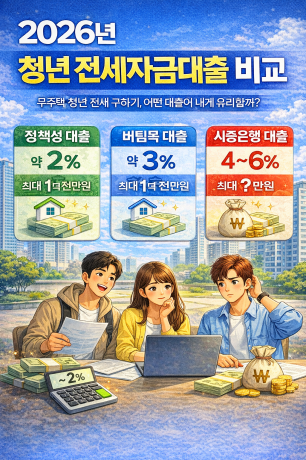 2026년 기준 청년 전세자금대출 조건과 금리를 비교했습니다. 청년전용 정책성 대출, 일반 버팀목, 시중은행 상품을 쉽게 이해하고 선택하는 방법까지 정리.