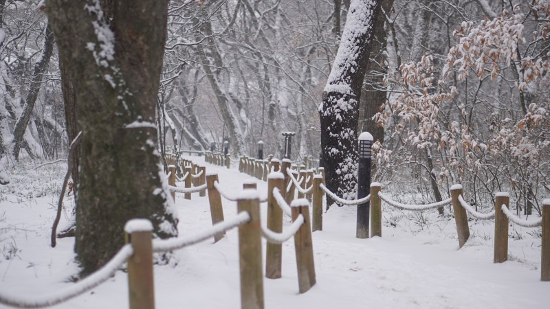 잎이 떨어진 나무 사이로 길의 흐름과 숲의 깊이가 자연스럽게 읽히고, 눈이 살짝 내린 날에는 차분한 겨울 숲의 분위기를 온전히 느낄 수 있습니다.