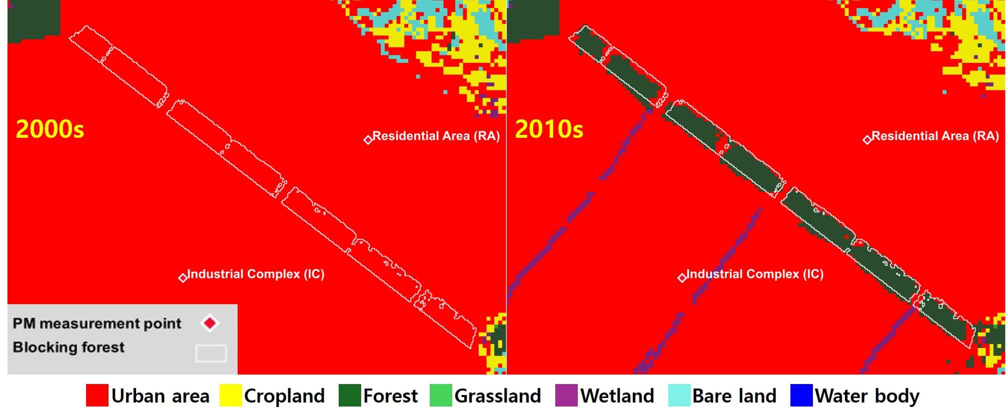 산업체가 밀집한 시화산업단지와 주거지 경계 부에 100m폭의 완충 숲 조성 후 주거지역의 미세먼지 농도는 산업단지에 비해 27%가 낮아졌다.(국립산림과학원, 2018)