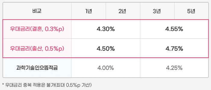 - 출산 시 0.5%p 우대금리가 기본금리에 추가로 적용되어, 최대 연복리 4.75%를 받을 수 있다.
