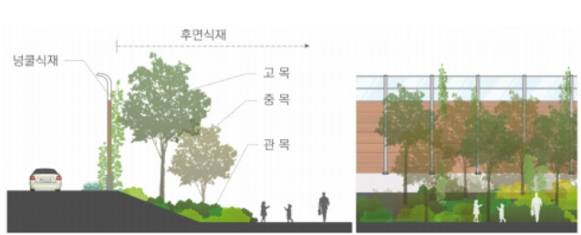- 식재 공간 확보와 관리 용이성을 고려하여 방음시설과 연계된 식재 공간 계획